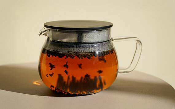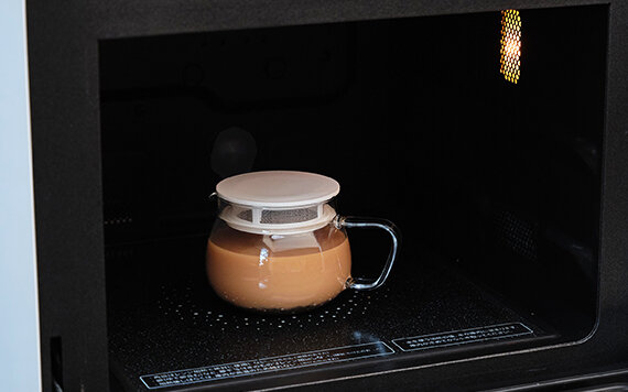 茶葉がジャンピングしやすい丸い形と、注ぎやすいフタ付き茶こし。