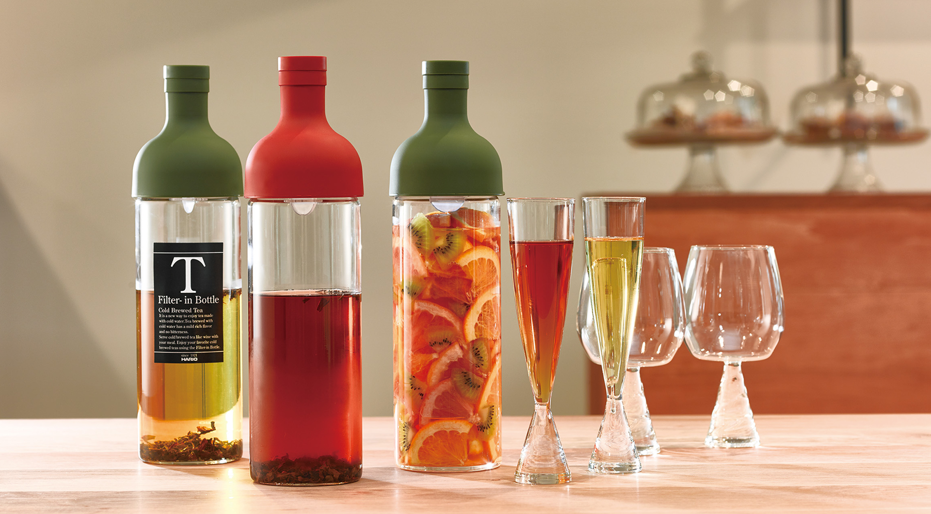 ワインのように食事の時に水出し茶を愉しんでいただきたいという思いからできた、ワインボトル型のフィルターインボトル。