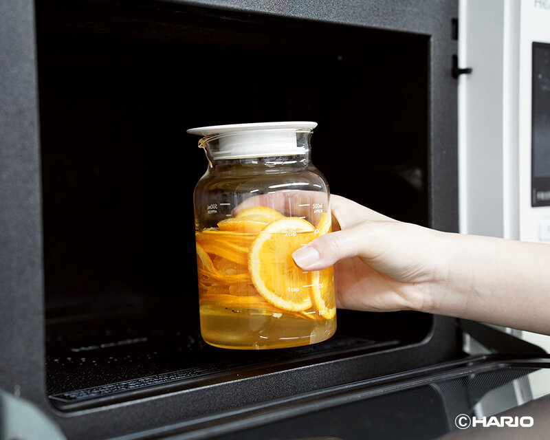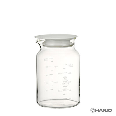 耐熱ガラス製でメモリ付き、フタをしたまま温め・注ぐことができます。
